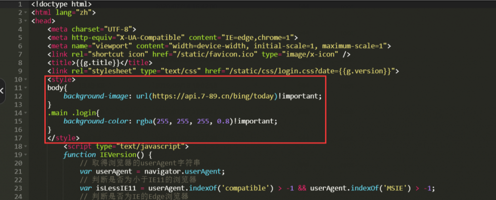 宝塔的登录页面挺单调的,于是想了想,把bing的每日一图作为背景作为背景教程从文件进去,找到/www/server/panel/BTPanel/templates/default/login.html将一下代码添加到图中位置<style> body{ background-image: url(https://api.7-89.cn/bing/today)!...